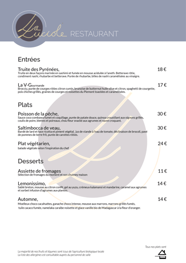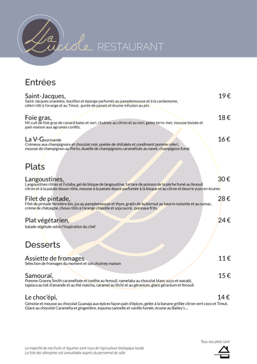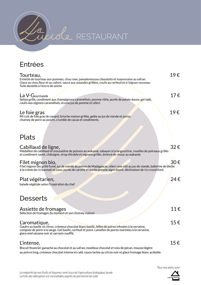 Nous vous proposons une formule traditionnelle revisité à l'ardoise, façon "La Luciole".
